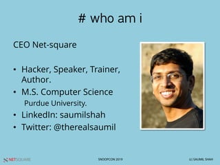 Saumil Shah's presentation at Snoopcon 2019 focuses on ARM shellcode techniques, including polyglot tricks and the implementation of 'quantum leap' shellcode that switches between ARM and Thumb modes. The talk highlights the intricacies and benefits of using ARM and Thumb instruction encodings for efficient shellcode execution while avoiding signature detection. The presentation concludes with the potential for further exploration in ARM shellcoding opportunities.