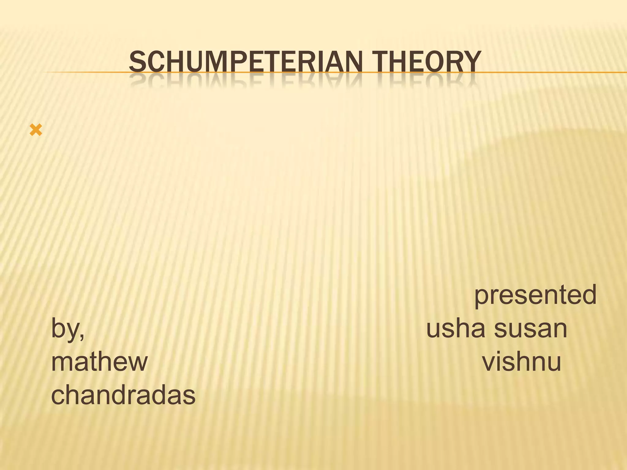 1. Schumpeter's model of economic development assumes a stationary economy in equilibrium that is disrupted by innovations introduced by entrepreneurs.