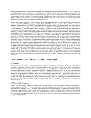 This document discusses integrated approaches to climate risk management and risk transfer to increase urban resilience. It argues that insurance can help soften financial impacts of disasters, increase effectiveness of contingency plans, and encourage risk reduction measures. The document outlines a project to develop an integrated climate risk management concept for urban areas in China that combines risk analysis, prevention, preparedness, and risk transfer solutions like insurance. The goal is to provide timely financial resources after disasters and incentivize measures that build long-term resilience.