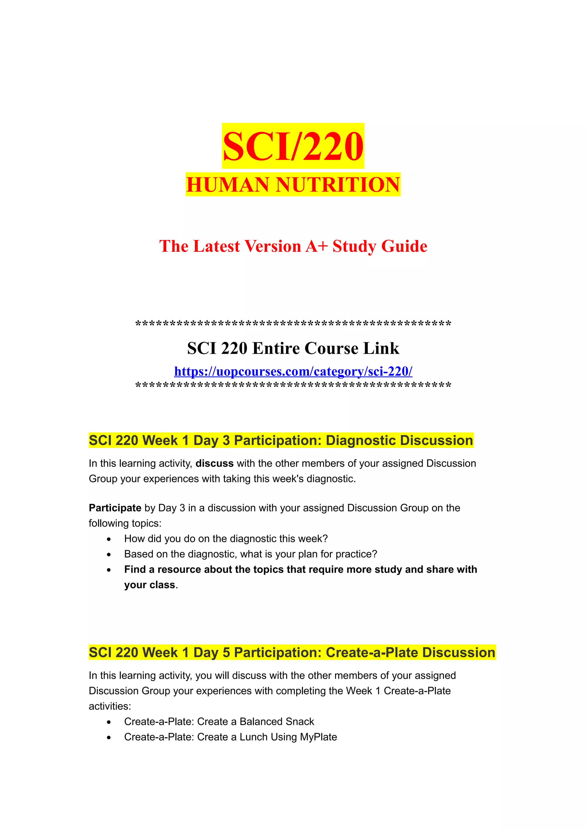 This document outlines the course content and assignments for SCI 220 Human Nutrition. It includes discussion topics on diagnostics, Create-a-Plate activities, and a weekly exam covering chapters 1-3 on nutrition guidelines, food choices, and digestion. Students are asked to participate in online discussions by sharing their diagnostic experiences, meal plans meeting criteria like high fiber or whole grains, and resources for topics requiring further study.