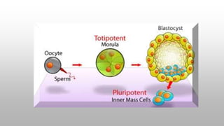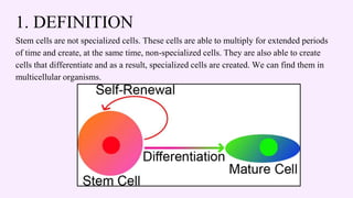 Stem cells are unspecialized cells that can differentiate into specialized cell types and can self-renew to produce more stem cells. There are several types of stem cells including totipotent, pluripotent, multipotent, oligopotent, and unipotent cells. Stem cells also come from different sources such as embryonic stem cells obtained from blastocysts, adult or somatic stem cells found in tissues, and induced pluripotent stem cells created in the laboratory. Stem cell research offers potential benefits for treating diseases through regenerative medicine, immune therapies, and gene therapies. However, the use of embryonic stem cells remains controversial due to ethical concerns regarding the destruction of embryos.