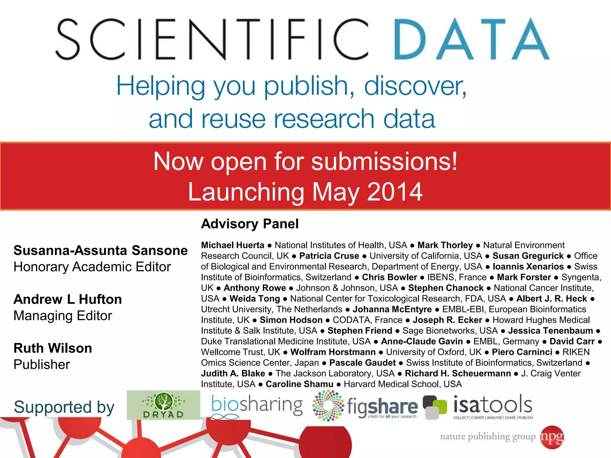 This document outlines plans for a new content type called a Data Descriptor to be launched in May 2014 by the journal Scientific Data. A Data Descriptor will consist of an article component and a structured metadata component. It aims to provide all the information needed to understand, reuse, and reproduce datasets in a peer-reviewed publication. This will help address barriers to data sharing by providing credit for sharing data and making datasets more discoverable and reusable through standardized metadata. The Data Descriptor is presented as a complement to traditional journal articles and data repositories.