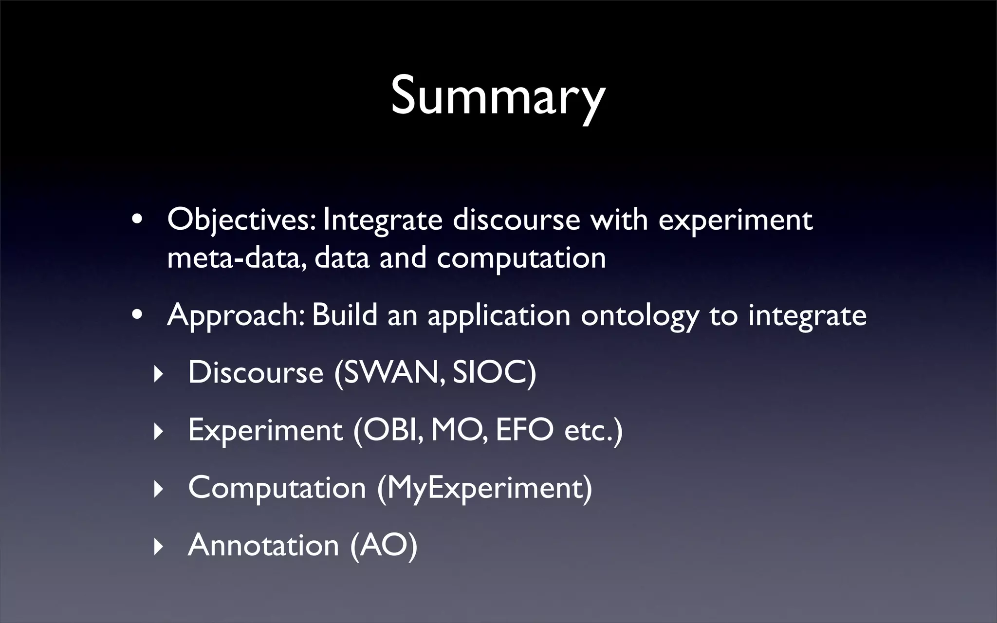 This document discusses integrating scientific discourse, data, and experiments through an application ontology. It aims to link claims in publications to experiments, data, and computations. The approach involves building an ontology to integrate discourse, experiment metadata and types of data using existing ontologies. It describes using the ontology to represent study design, data acquisition, processing, analysis and interpretation. It provides examples of study design types and assays. The next steps are to publish an updated ontology and produce RDF from study repositories to link claims with data and experiments.