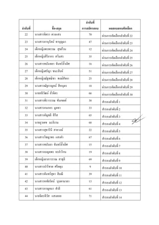 ปี การศึกษา 2556 โรงเรียนกันทรารมณ์ อําเภอกันทรารมย์ จังหวัดศรีสะเกษ ลําดับที่ ลําดับที่ ชื่อ-สกุล การสมัครสอบ ผลสอบสอบคัดเลือก 1 นายกิตติศกดิ์ ทองทิพย์ ั 21 ผ่านการคัดเลือกลําดับที่ 1 2 นางสาวศิรดา อั้งดา 10 ผ่านการคัดเลือกลําดับที่ 2 3 นางสาวหนึ่งฤทัย อังกินนท์ ั 49 ผ่านการคัดเลือกลําดับที่ 3 4 นางสาวกนกอร สายโสม 36 ผ่านการคัดเลือกลําดับที่ 4 5 นางสาวปานชีวา เครื อคุณ 46 ผ่านการคัดเลือกลําดับที่ 5 6 นางสาวอารี ยา ผิวนวล 48 ผ่านการคัดเลือกลําดับที่ 6 7 นางสาววชิรญา คํามูล 23 ผ่านการคัดเลือกลําดับที่ 7 8 เด็กหญิงปวีณา บุญใหญ่ 14 ผ่านการคัดเลือกลําดับที่ 8 9 นางสาวจินตนา ภาคะ 11 ผ่านการคัดเลือกลําดับที่ 9 10 นายพรพิพฒน์ บุญหล้า ั 41 ผ่านการคัดเลือกลําดับที่ 10 11 เด็กหญิงโชติมา ช่วงสําโรง 43 ผ่านการคัดเลือกลําดับที่ 11 12 นางสาววนัชพร ยานแก้ว 29 ผ่านการคัดเลือกลําดับที่ 12 13 เด็กหญิงนริ ศรา วินทะไชย 72 ผ่านการคัดเลือกลําดับที่ 13 14 นายธนพล ศรี บุญเรื อง 1 ผ่านการคัดเลือกลําดับที่ 14 15 นางสาวสุ ทธิดา จิตดี 27 ผ่านการคัดเลือกลําดับที่ 15 16 นางสาวกมลรัตน์ แสงเดช 45 ผ่านการคัดเลือกลําดับที่ 16 17 นางสาวนภัสวรรณ โสระรา 44 ผ่านการคัดเลือกลําดับที่ 17 18 เด็กชายจักรี สลับศรี 32 ผ่านการคัดเลือกลําดับที่ 18 19 นางสาวณิ ชภรณ์ คําศิริ 24 ผ่านการคัดเลือกลําดับที่ 19 20 เด็กหญิงรัตนา วงษ์นิล 8 ผ่านการคัดเลือกลําดับที่ 20 21 นายพีรณัฐ พิมพ์พฒน์ ั 40 ผ่านการคัดเลือกลําดับที่ 21