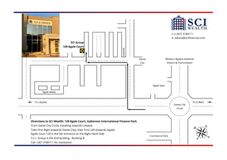 SCI Wealth is located at 129 Kgale Court in the Gaborone International Finance Park. To get there from Game City Circle, take the first right towards Game City, then the first left towards Kgale. Kgale Court 129 will be the fifth entrance on the right. SCI Group is the second building, labeled Building B. The phone number for assistance is +267 3180111.