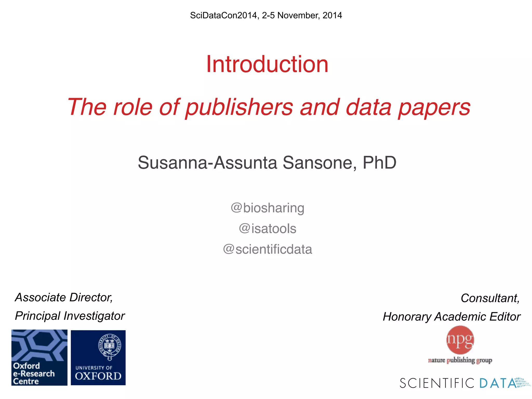 The document discusses the evolution of data papers and their significance in scientific publishing, emphasizing the role of publishers in facilitating data sharing and reproducibility. It highlights the challenges of data unavailability, legal barriers to sharing, and the need for better-supported open data practices. The introduction of data descriptors aims to improve the discoverability and reusability of datasets, ensuring that critical methodological details are accessible for future research applications.