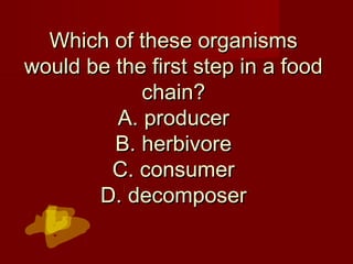 The document presents a series of questions related to food chains and ecological roles of organisms. It covers topics such as producers, herbivores, consumers, and decomposers, including identifying which organisms fit into each category. Key statements to assess include the characteristics of herbivores and carnivores.