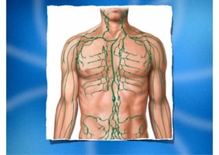 The lymphatic system removes excess fluid from tissues and returns it to the bloodstream. Lymph, the fluid collected in lymphatic vessels, contains lymphocytes that help the body fight disease. The lymph passes through lymph nodes which filter out pathogens and foreign materials, and swells when fighting infection. Important lymphatic organs include the tonsils, thymus, and spleen, which all help the immune system by filtering pathogens from the blood or lymph and producing lymphocytes. HIV attacks lymphocytes and weakens the immune system, leaving the body vulnerable to opportunistic infections.