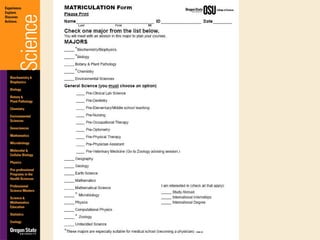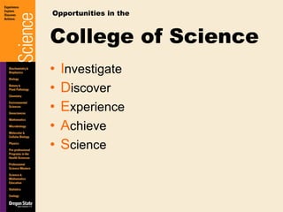 The document provides information for new science students at Oregon State University about advising, course registration, degree requirements, and resources. It outlines the advising process for the following day which includes meeting with advisors in groups to select courses and make schedules. It also reviews math and science placement, sample first-year schedules, degree requirements, and various campus resources and support services available.