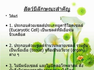 สัตว์มีลักษณะสำคัญ ได้แก่ 1. ประกอบด้วยเซลล์ประเภทยูคารีโอตเซลล์ (Eucaryotic Cell) เป็นเซลล์ที่มีเยื่อหุ้มนิวเคลียส 2. ประกอบด้วยเซลล์จำนวนหลายเซลล์ รวมกันเป็นเนื้อเยื่อ (tissue) หรือเป็นอวัยวะ (organ) ต่าง ๆ 3. ไม่มีผนังเซลล์ และไม่มีคลอโรพลาสต์ ดังนั้นจึงไม่สามารถสร้างอาหารเองได้โดยขบวนการสังเคราะห์ด้วยแสง - 3.