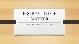 Materials can be classified as useful or harmful depending on their intended uses and effects. Useful materials include food, medicine, cleaning products, and more. These materials must be properly disposed of to avoid pollution or harm. Some key points: