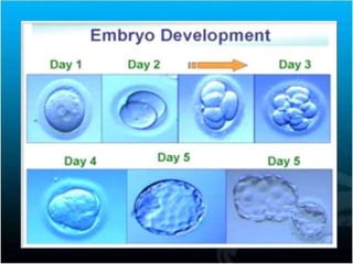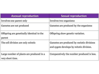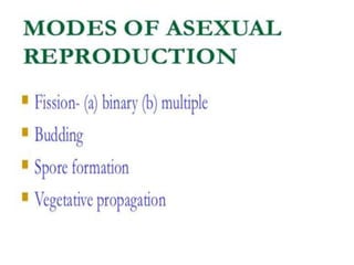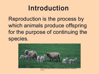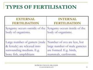 There are two types of reproduction: sexual and asexual. Sexual reproduction involves both male and female reproductive organs and gametes fusing during fertilization. The male organs produce sperm and the female organs produce eggs. Fertilization occurs when a sperm fuses with an egg in the fallopian tubes, forming a zygote that develops into an embryo and fetus. Fertilization can be internal, occurring inside the female body as in humans, or external, occurring outside the body as in fish. Asexual reproduction requires only one parent and produces offspring that are genetically identical through processes like budding.