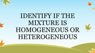 This document discusses different methods for separating mixtures: hand picking, filtration, and sieving. Hand picking involves separating components of a mixture that are large enough to pick up by hand. Sieving uses a sieve to separate mixtures where components have different sizes. Filtration uses a filter paper or cloth to separate solid and liquid mixtures, allowing only the fluid to pass through. Examples are given of separating mixtures using each method.