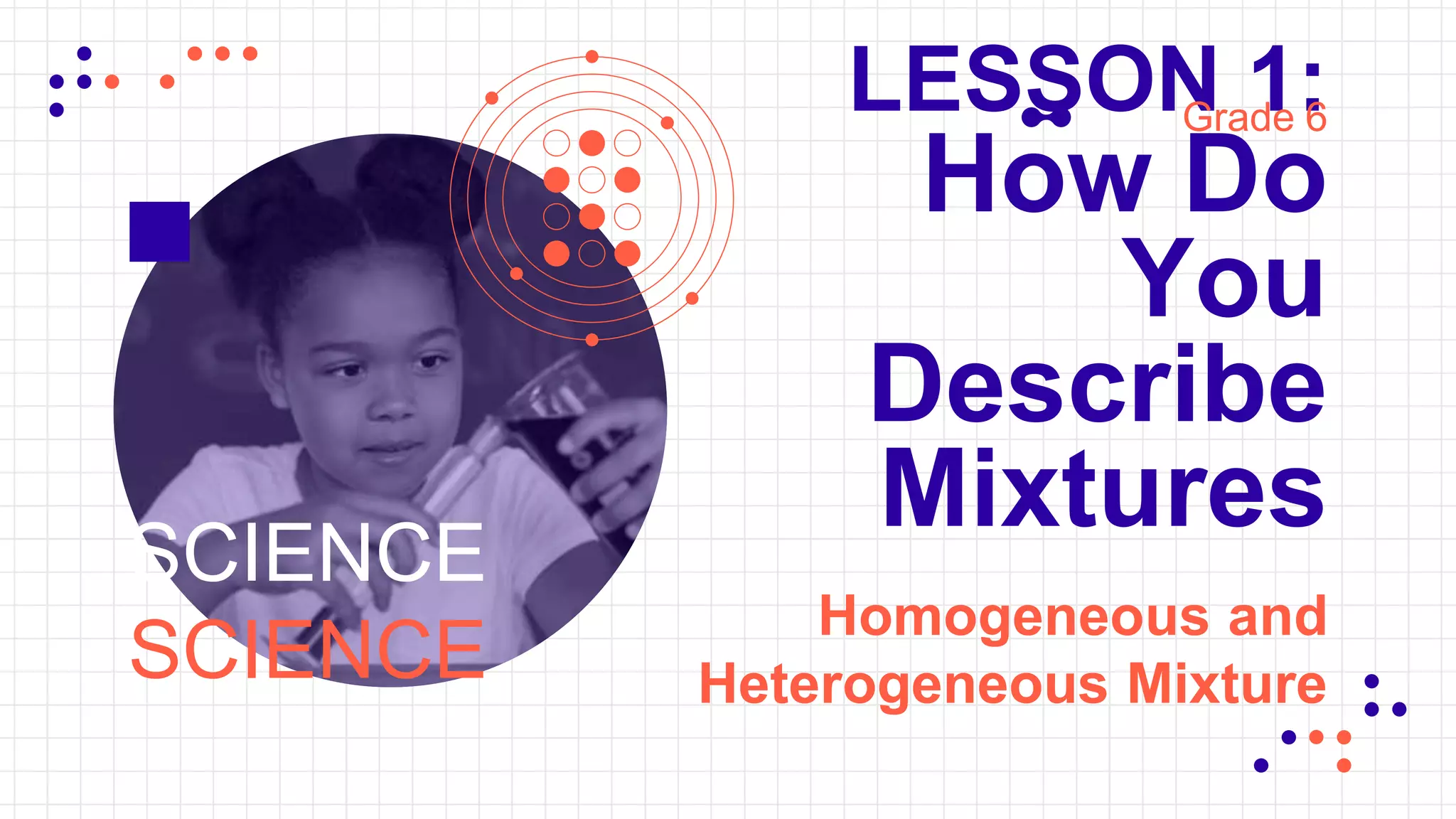 This document contains lesson materials about mixtures for 6th grade science students. It includes objectives for the lesson, such as classifying mixtures and identifying mixtures found at home. It defines homogeneous and heterogeneous mixtures and discusses different types of mixtures like solutions. It provides examples of solid, liquid, and gas mixtures. It also includes practice questions to test student understanding of mixtures and chemistry concepts.
