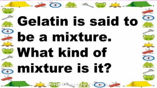 The document discusses colloids, highlighting their characteristics as heterogeneous mixtures with specific properties such as particle size, stability, and Brownian motion. Examples include milk, toothpaste, and blood, emphasizing that colloids cannot be separated by filtration and exhibit the Tyndall effect when light is scattered. Applications of colloids range from water purification to medicine and food production.