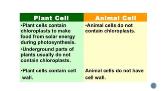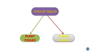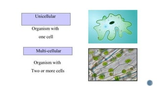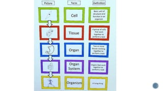 Cells are the basic units of life that make up all living things. They carry out three basic life processes: nutrition, reproduction, and sensitivity. Cells contain organelles that carry out different functions - the membrane controls what enters and exits, the nucleus controls the cell, and the cytoplasm contains organelles and carries out their functions. Cells are organized into levels with cells forming tissues, tissues forming organs, and organs forming systems. There are different types of tissues including blood, muscle, bone, nervous, fat, and epithelial tissues that have specific functions like movement, support, information transport, storage, and protection.