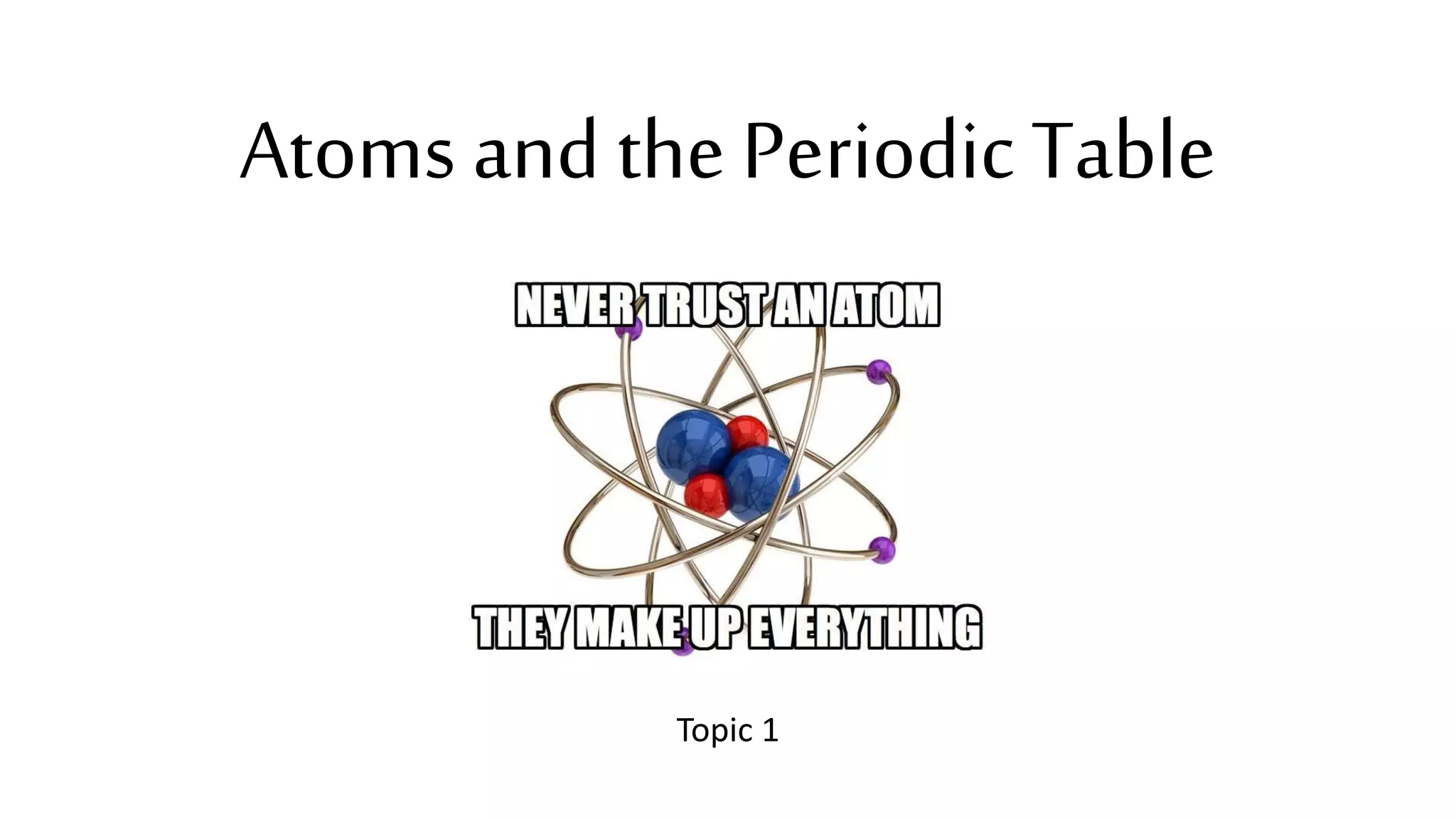 The document discusses the history of atomic theory from ancient Greek philosophers to modern scientists. It explains that Democritus first proposed the idea of atoms as indivisible pieces of matter. John Dalton further developed atomic theory in the 1700s, proposing that elements are made of unique atoms that combine in fixed ratios. J.J. Thomson, Ernest Rutherford, Niels Bohr, and James Chadwick contributed key discoveries about atomic structure through the early 1900s, such as identifying the electron and nucleus. The periodic table organizes elements based on their atomic structure and properties.