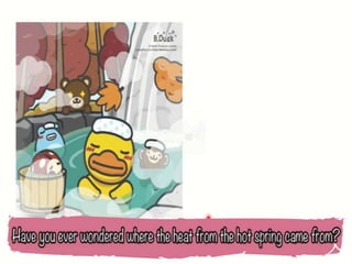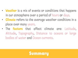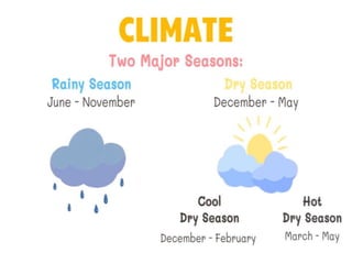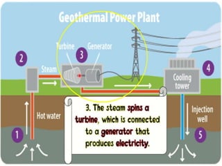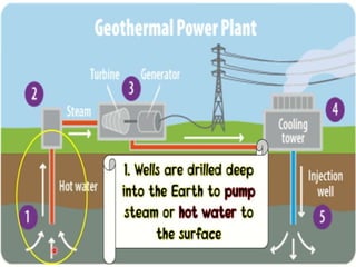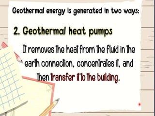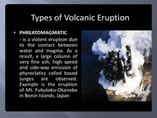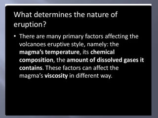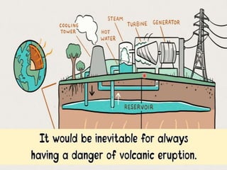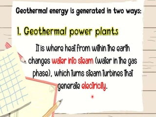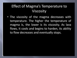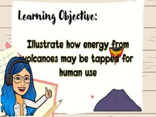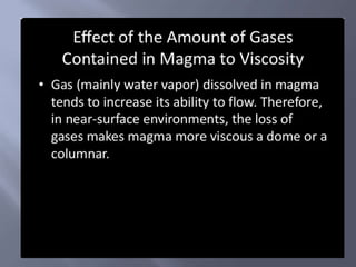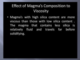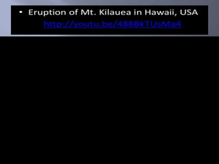 This document contains information about different types of lava flows and volcanic eruptions. It discusses how the viscosity and silica content of lava determines the type of flow. Lava with high viscosity and less silica piles up at vents to form domes, while lava with less silica and low viscosity can travel farther to form thin sheets. The document also provides instruction to students to list the five types of volcanic eruptions and the processes involved in geothermal energy production, as well as the advantages and disadvantages of geothermal energy. Finally, it instructs students to identify weather elements, seasons in the Philippines, and five factors that affect climate.