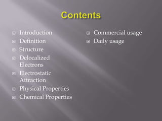 Metallic bonding occurs when metal atoms bond through delocalized electrons. Metals form a lattice structure with positive metal ions surrounded by a sea of delocalized electrons that are attracted to the positive ions. This bonding allows metals to have distinctive physical and chemical properties including malleability, conductivity, and high melting points. Metallic bonding is important for creating alloys and is found in many materials used in daily life.