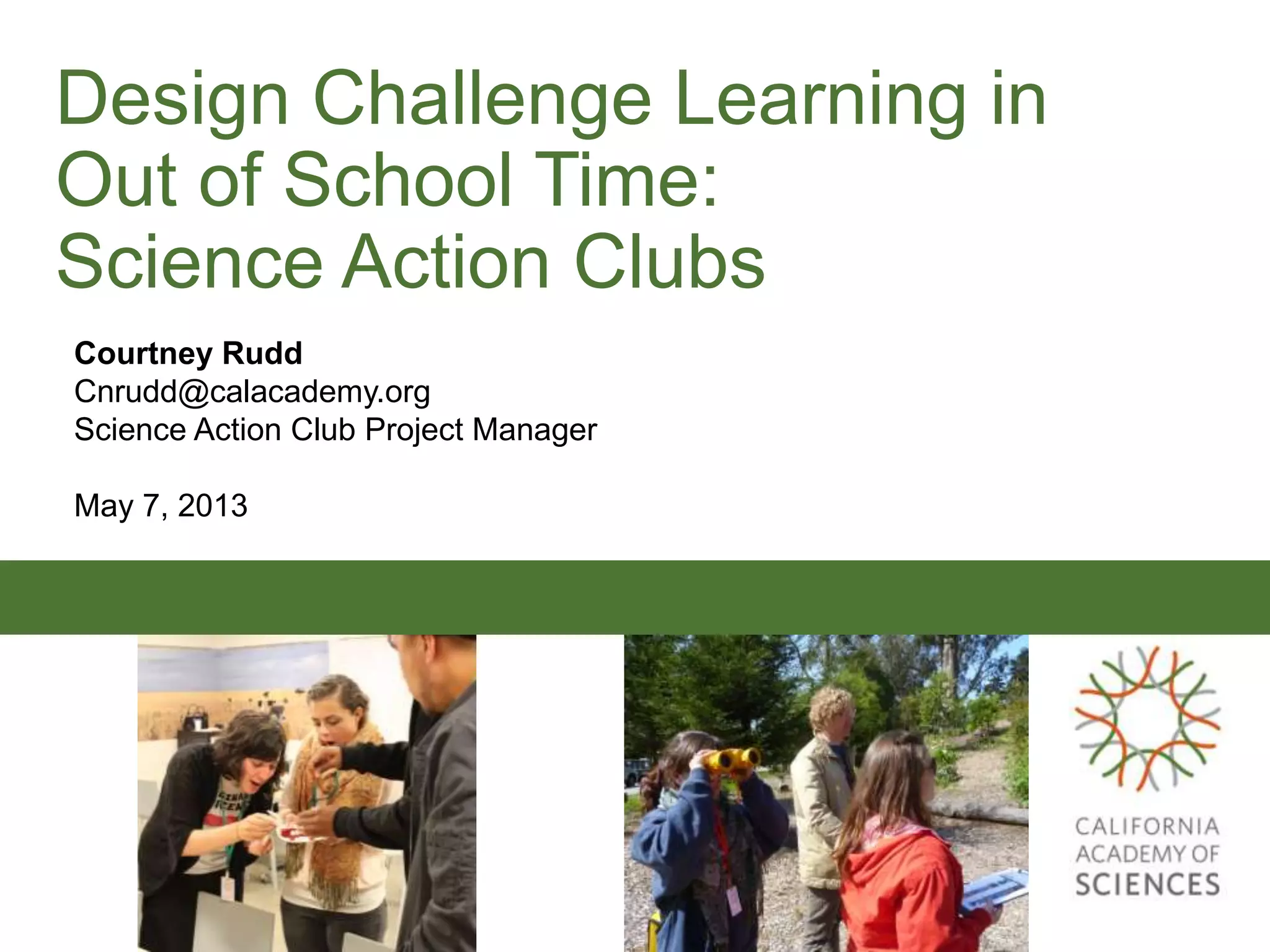 The document discusses the Science Action Club program at the California Academy of Sciences, which aims to spark youth interest in science through hands-on, inquiry-based learning. The program provides professional development for afterschool staff and offers a STEM curriculum for students in grades 6-8 linked to citizen science projects. The approach focuses on design challenge learning, giving youth opportunities to brainstorm, problem-solve, and discuss their ideas and designs. Staff are provided with strategies to support and challenge youth through the process, such as asking questions, encouraging wild ideas, and recognizing achievements.