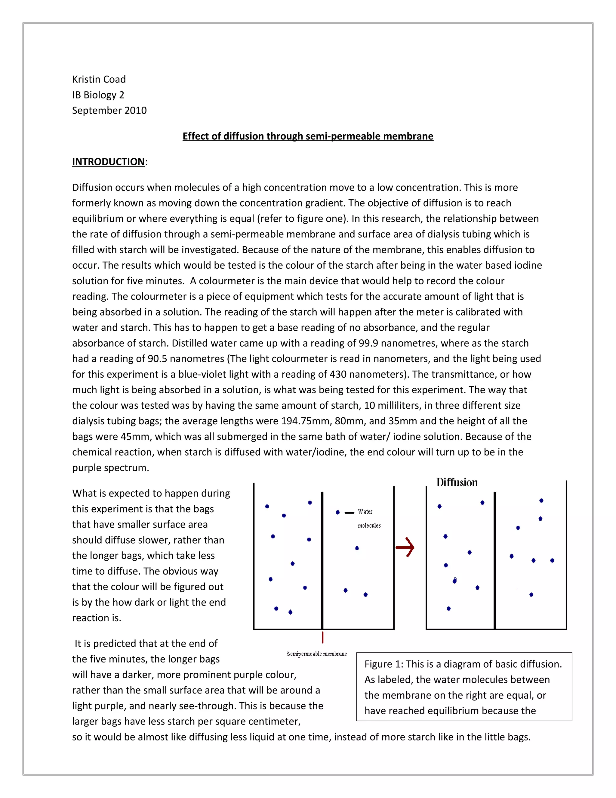 This lab experiment investigated how the rate of diffusion through a semi-permeable membrane is affected by the surface area of the membrane. Starch-filled dialysis tubing of three different lengths were submerged in an iodine solution, and the color change of the starch over five minutes was measured. It was hypothesized that tubing with smaller surface area would diffuse more slowly. The results supported this, as the shortest tubing produced the lightest color after five minutes, indicating slower diffusion. Areas for improving the experiment were also identified.