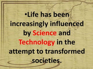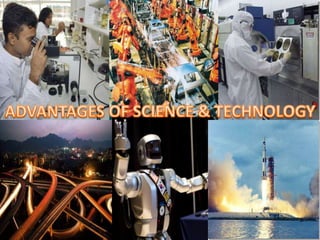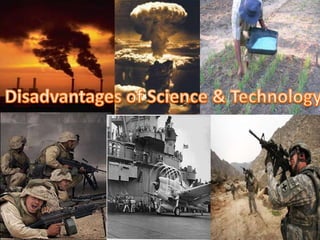 - Both benefits and drawbacks of science and technology are outlined such as how it has helped improve living standards but also caused environmental pollution and climate change from factory emissions.