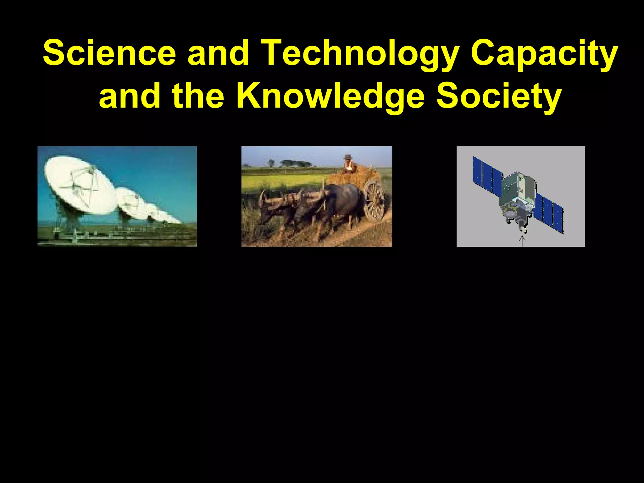 This document discusses the transition to a global knowledge society and the need to build science and technology capacity worldwide. It notes that the 21st century will be driven by knowledge and innovation. However, wide gaps exist between developed and developing nations in areas like human capital, infrastructure, and access to information that are critical in the new knowledge economy. The document outlines strategies needed to strengthen science education, access to scientific literature, and international cooperation to help build science and technology capabilities in all countries.