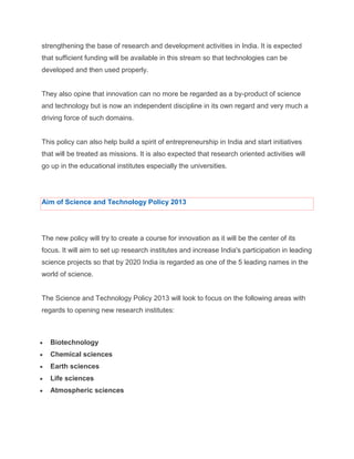 The Indian government unveiled a new Science and Technology Policy in 2013 to replace the 2003 policy. The new policy was created following discussions with 5,400 representatives from industry and science. It aims to increase research for social benefit and public participation in science. The policy hopes to boost innovation, research funding, and global scientific participation to make India one of the top 5 global scientific powers by 2020 in areas like biotechnology and particle physics. However, it faces challenges in meeting funding goals and private sector involvement.