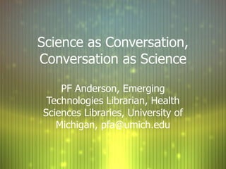 The document discusses how scientific research and discovery has historically occurred through conversation and debate. It provides examples of early scientific journals that documented discussions and debates among researchers. It also gives examples of individual researchers, such as Garrett Lisi, who utilized blogging and social media to engage in ongoing public discussion about their work. The document raises questions about how current social technologies are facilitating scientific conversations, how these conversations may be changing the nature of science and research, and how libraries and archives can track and preserve ongoing scientific discourse.