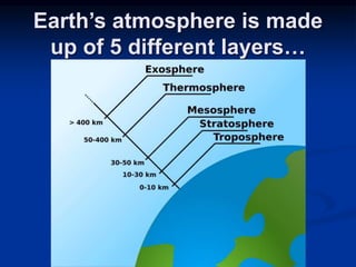 The document discusses the five layers of Earth's atmosphere from the surface outwards: