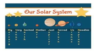 This document provides information about the solar system and the motion of Earth and the moon. It defines key terms like axis, rotation, revolution, and orbit. It describes the basic components of the solar system including the sun, planets, and how Earth and the moon move in relation to each other and the sun. Night and day are caused by Earth's rotation on its axis. The moon orbits Earth and the Earth revolves around the sun in its yearly orbit.