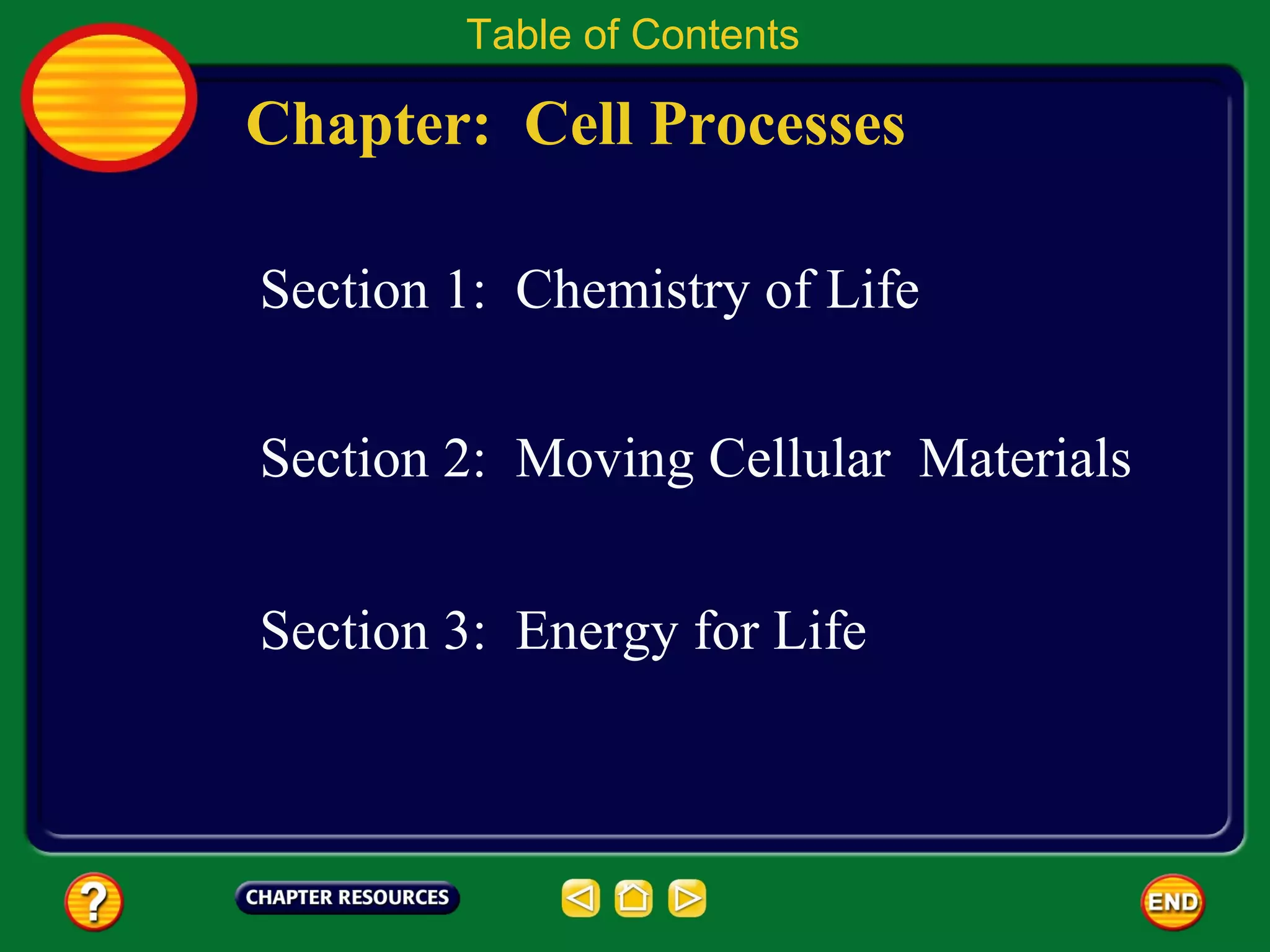 This document contains an outline of sections from a chapter on cell processes. The sections include: Chemistry of Life, Moving Cellular Materials, and Energy for Life. Chemistry of Life covers topics like matter, atoms, elements, compounds, mixtures, organic compounds, carbohydrates, lipids, proteins, nucleic acids, and water. Moving Cellular Materials discusses passive transport mechanisms like diffusion, osmosis, and facilitated diffusion as well as active transport and endocytosis/exocytosis. Energy for Life addresses metabolism, photosynthesis, cellular respiration, fermentation, and the breakdown and storage of carbohydrates.