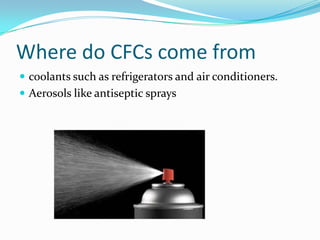 CFCs (chlorofluorocarbons) are man-made substances that were formerly used in aerosols and refrigerants. CFCs deplete the ozone layer by breaking ozone molecules into oxygen when exposed to ultraviolet radiation. A single CFC molecule can destroy 100,000 ozone molecules in its lifetime. An international agreement called the Montreal Protocol was implemented to phase out CFC production and allow the ozone layer to recover. While CFCs are being eliminated, continued monitoring is important to ensure protection of the ozone layer.