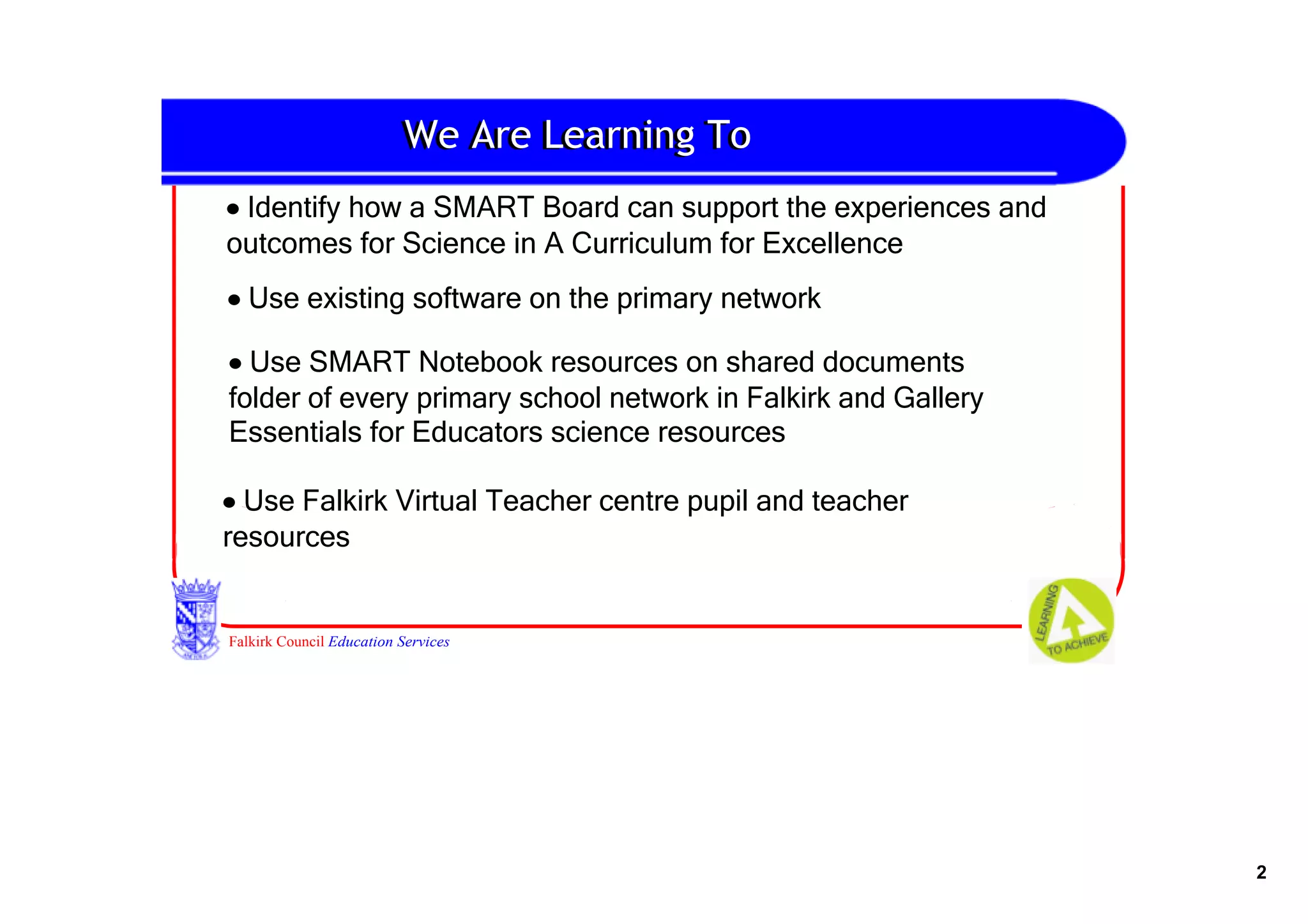 This document discusses how a SMART Board can support primary science education based on the Scottish curriculum. It outlines software tools like Kidspiration, Number Magic and Crocodile Clips that can be used. It also discusses using SMART Notebook resources from the gallery and shared folders, which include topics like animals, astronomy, biology, chemistry and more. Resources from the Falkirk Virtual Teacher Center are also recommended.