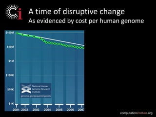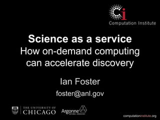 This document discusses building a "discovery cloud" to accelerate scientific discovery through on-demand computing. It proposes identifying time-consuming research activities that can be automated and outsourced as software-as-a-service. This would achieve economies of scale through leveraging infrastructure-as-a-service. The goal is to create a great user experience for scientific data management similar to consumer services like Dropbox. It also discusses integrating services like Globus for data management and Galaxy for analysis to provide flexible and scalable genomics analysis.