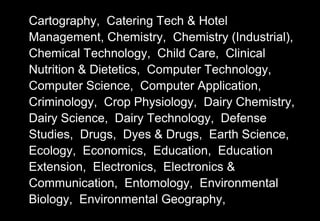 This document lists various science and engineering courses available at the B.Sc level. It includes over 150 science subjects across many disciplines like agriculture, biology, chemistry, computer science, earth science, economics, engineering, environmental science, food science, geography, geology, healthcare, mathematics, physics, social science, statistics and more. It also lists over 30 branches of engineering including aerospace, automobile, biomedical, chemical, civil, computer, electrical, electronics, environmental, food technology, mechanical and others. Finally, it provides a table showing the best career-focused courses in sectors like pharmacy, healthcare, hospitality, media and others.