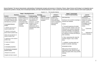 The document outlines the secondary education curriculum for science in four years. It focuses on developing an understanding of fundamental science concepts and processes through an integrated approach. In the first year, students learn integrated science covering concepts in chemistry, physics, space science and ecology. In subsequent years, the focus shifts to integrative biology, chemistry and physics deepened through connections to other disciplines. Across all four years, students apply their learning to critically analyze and solve problems, think innovatively, and make informed decisions to protect the environment and promote sustainability. One example quarter's content on the scientific method is also summarized, covering stages of formulating a research problem and investigation using that method.