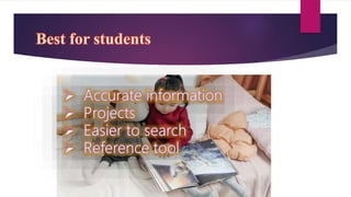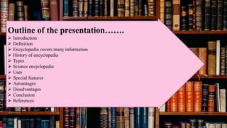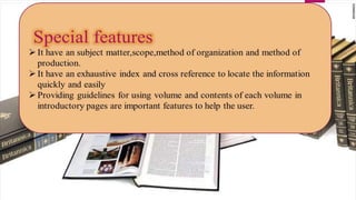 The document discusses encyclopedias, including their history and types. It provides background on print encyclopedias and how they evolved from early references works created in ancient times. More recently, digital encyclopedias available online have grown in popularity due to providing convenient access to information. Encyclopedias aim to comprehensively summarize knowledge across many topics for educational purposes, though they only provide shallow levels of information on many subjects.