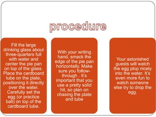 The document describes an experiment called the Egg Drop that illustrates Newton's Law of Inertia. The experiment involves placing an egg on a cardboard tube over a glass of water. When the pie plate under the tube is hit horizontally, the tube and egg will fall into the glass of water due to inertia, with the water providing a safe landing. The experiment works because according to Newton's First Law, an object at rest stays at rest and an object in motion stays in motion unless acted upon by an external force, so the egg continues falling straight down into the glass.