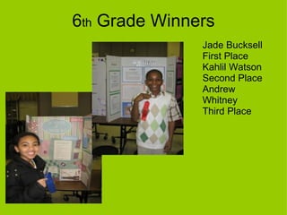 The document announces winners of a language arts competition for 6th and 7th graders, with Jade Bucksell taking first place in 6th grade and Xaviar Lambert taking first place in 7th grade. It also mentions that students enjoyed themselves at the event and that science was brought alive in an exciting way.