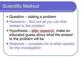 This document provides guidance for students on conducting a science fair project, including how to develop a question, conduct research to form a hypothesis, design an experiment with controls and variables, gather and organize data, analyze results, and present findings in a display board and journal. The scientific method process of question, research, hypothesis, experimentation, analysis and conclusion is outlined. Tips are provided on preparing materials lists, procedures, data recording, timelines, and titles for charts and graphs to effectively communicate their project work.