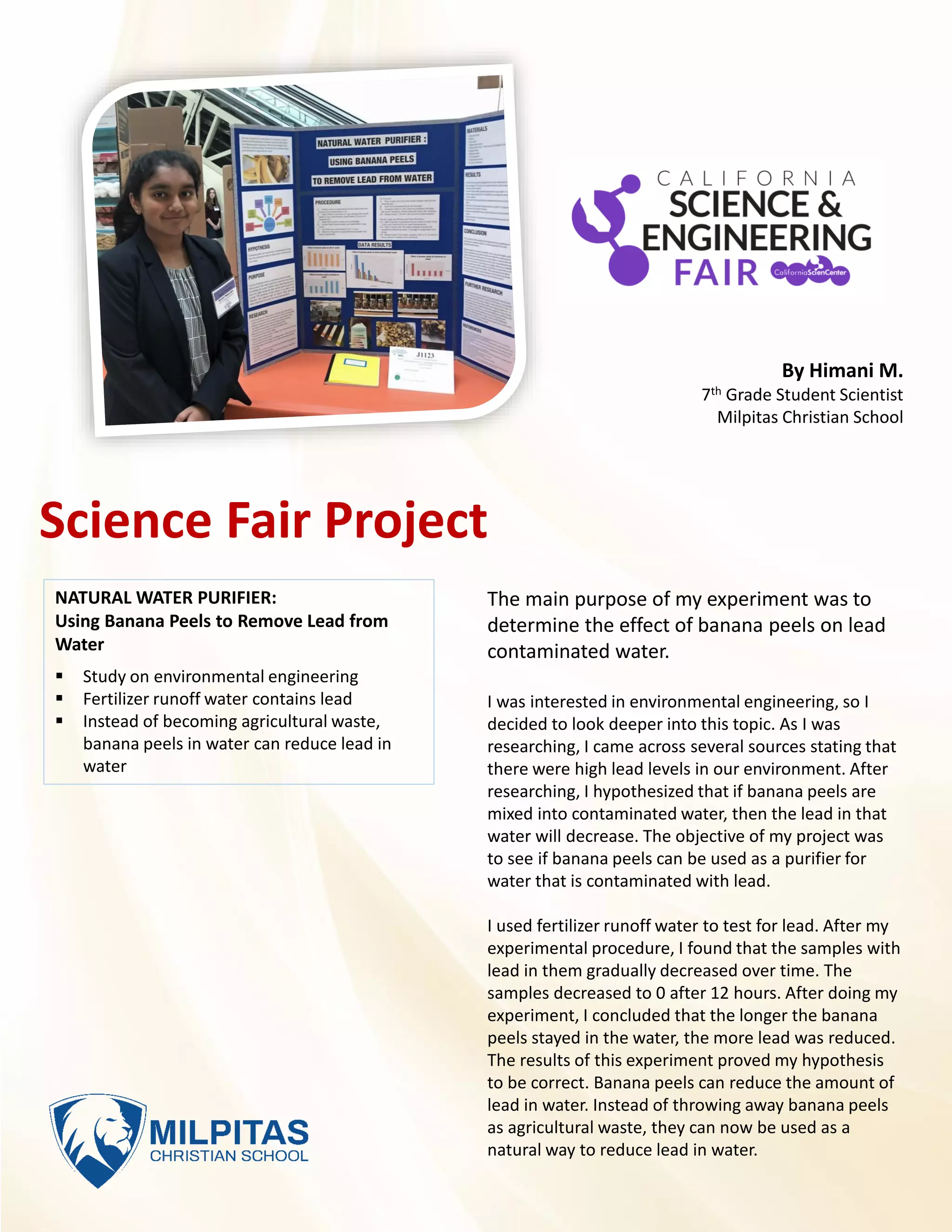 The student conducted a science fair project to test the effect of banana peels on reducing lead levels in contaminated water. They hypothesized that mixing banana peels into lead-contaminated water would decrease the amount of lead over time. Through an experimental procedure testing fertilizer runoff water, the student found that samples with banana peels gradually decreased their lead levels to zero after 12 hours. The results supported the hypothesis that banana peels can effectively reduce lead in water. The student concluded that banana peels have potential as a natural water purifier and method to reduce agricultural waste.