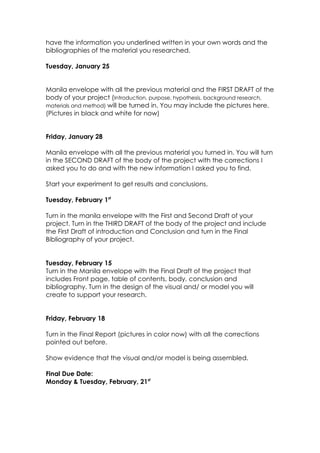 The document provides guidelines and due dates for a science fair project to be completed between January and February 2011. It outlines that the written report must include a title page, table of contents, abstract, introduction with purpose and hypothesis, background research, materials, procedure, results, conclusion, and bibliography. It specifies the formatting requirements for the written report and provides partial work due dates for submitting drafts and sections of the project, research materials, and the final written report and visual/physical models. The final due date is February 21st for presentations along with submitting the written report and a self/team evaluation.