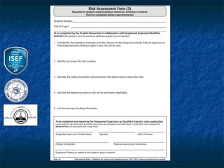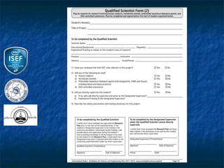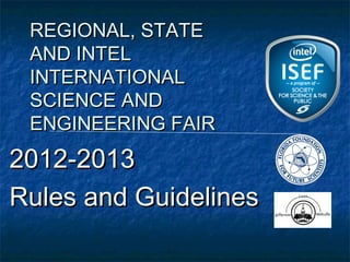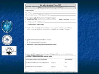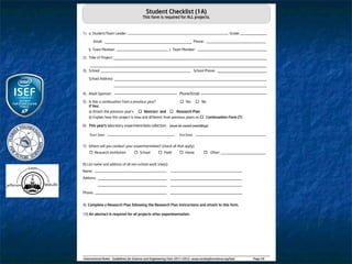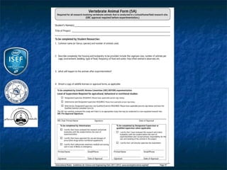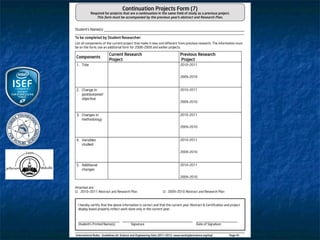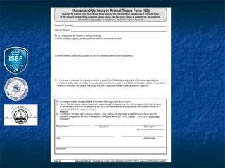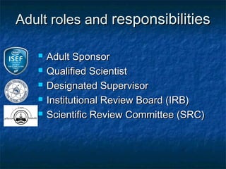This document outlines the rules and guidelines for the Regional, State and International Science and Engineering Fair. It discusses the roles and responsibilities of adult sponsors, qualified scientists, and oversight committees. It provides requirements for different types of student projects involving human subjects, vertebrate animals, and potentially hazardous biological agents. Projects must be reviewed and approved by Institutional Review Boards, Scientific Review Committees, and/or Institutional Animal Care and Use Committees as applicable before experimentation. Certain restrictions apply depending on the site of the research.