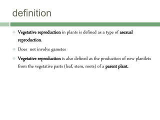 Vegetative reproduction is a type of asexual reproduction used by plants to produce new individuals without the use of seeds or spores. There are several types of vegetative reproduction including reproduction through leaves, stems, roots, and bulbs. Common methods used are stem cuttings, marcotting, and tissue culture. Vegetative reproduction allows plants to grow faster than from seeds and produce fruits more quickly, but it can lead to overcrowding and lack of genetic variation. It has many agricultural applications for clonal propagation of crops.