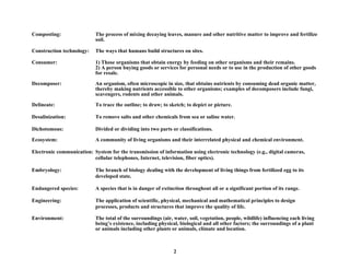 This document defines over 50 science-related terms across various fields including biology, chemistry, geology, and technology. Key terms defined include abiotic, biotic, ecosystem, homeostasis, hypothesis, niche, renewable resources, sustainability, system, and theory of evolution.