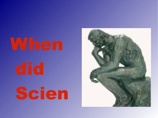 Ancient Greek science began around 300 BC and was focused on organizing the world and gaining knowledge in areas like astronomy, biology, physics and mathematics. Some of the major figures who studied these areas were Thales, Pythagoras, Anaxagoras, Empedocles, Aristotle, Archimedes and Democritus. Archimedes in particular made important contributions to the fields of mathematics and engineering through his principles of buoyancy and inventions.