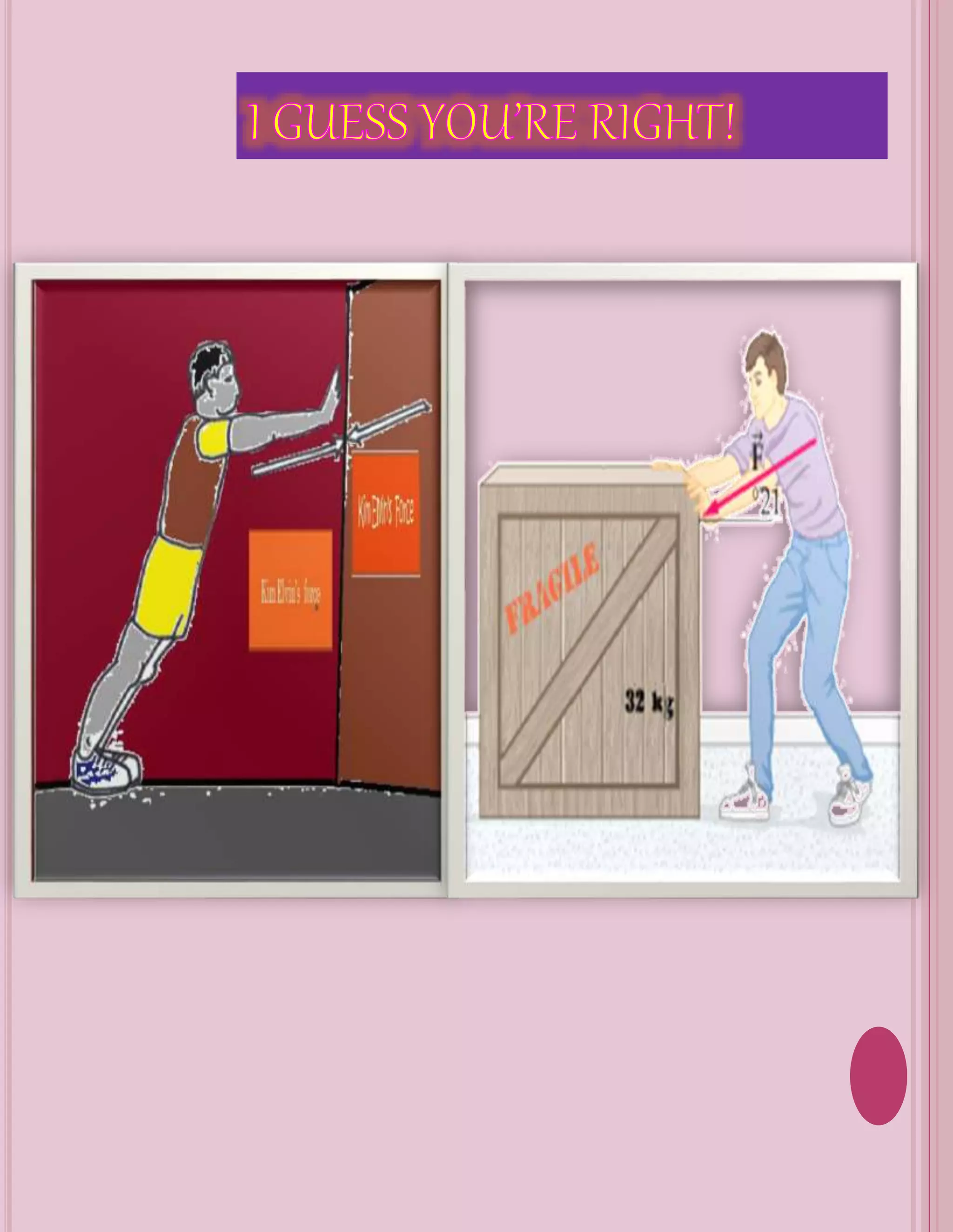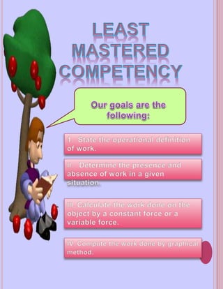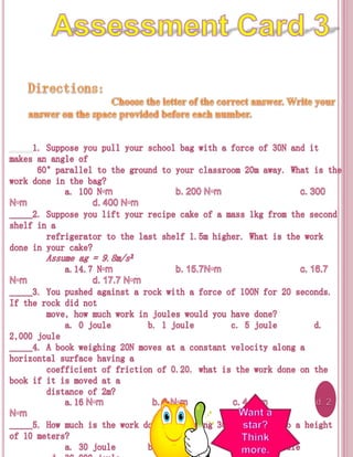 This document presents a science intervention material on the topic of work and forces for 4th year science students. It begins with an introduction to the concept of force, explaining contact and non-contact forces. Students are then guided through examples and problems to determine if work is done or not in different situations. The document provides formulas for calculating work, such as force x distance and mass x gravity x height. Sample problems are worked through applying these formulas. Vocabulary terms like force, distance, contact and displacement are reviewed. The material concludes by having students solve additional practice problems on calculating work.