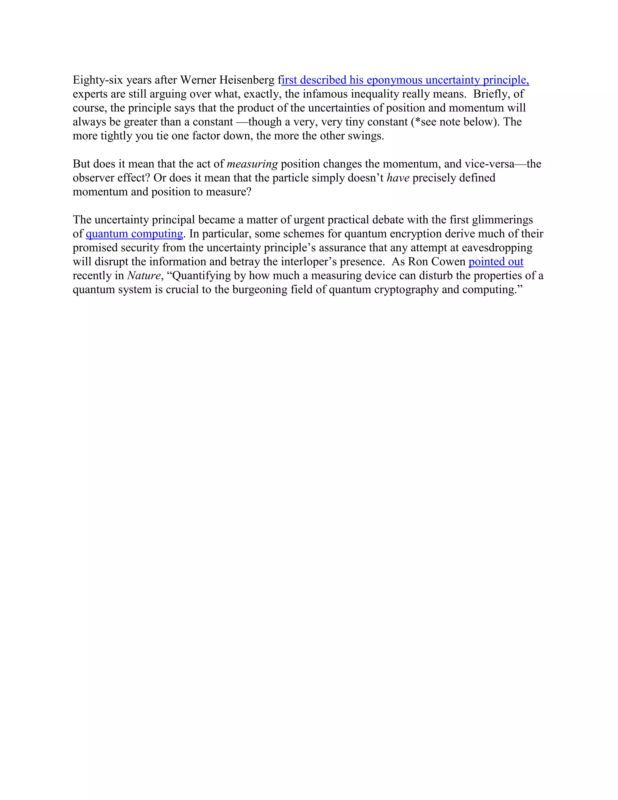The uncertainty principle proposed by Werner Heisenberg states that the more precisely one property of a particle is measured, like position, the less precisely another related property, like momentum, becomes known. Debate continues over whether this means measurement actively changes the measured property or if particles do not have precisely defined values. This debate is important for emerging fields like quantum computing and cryptography that aim to use the uncertainty principle for security by detecting any disruption from eavesdropping.