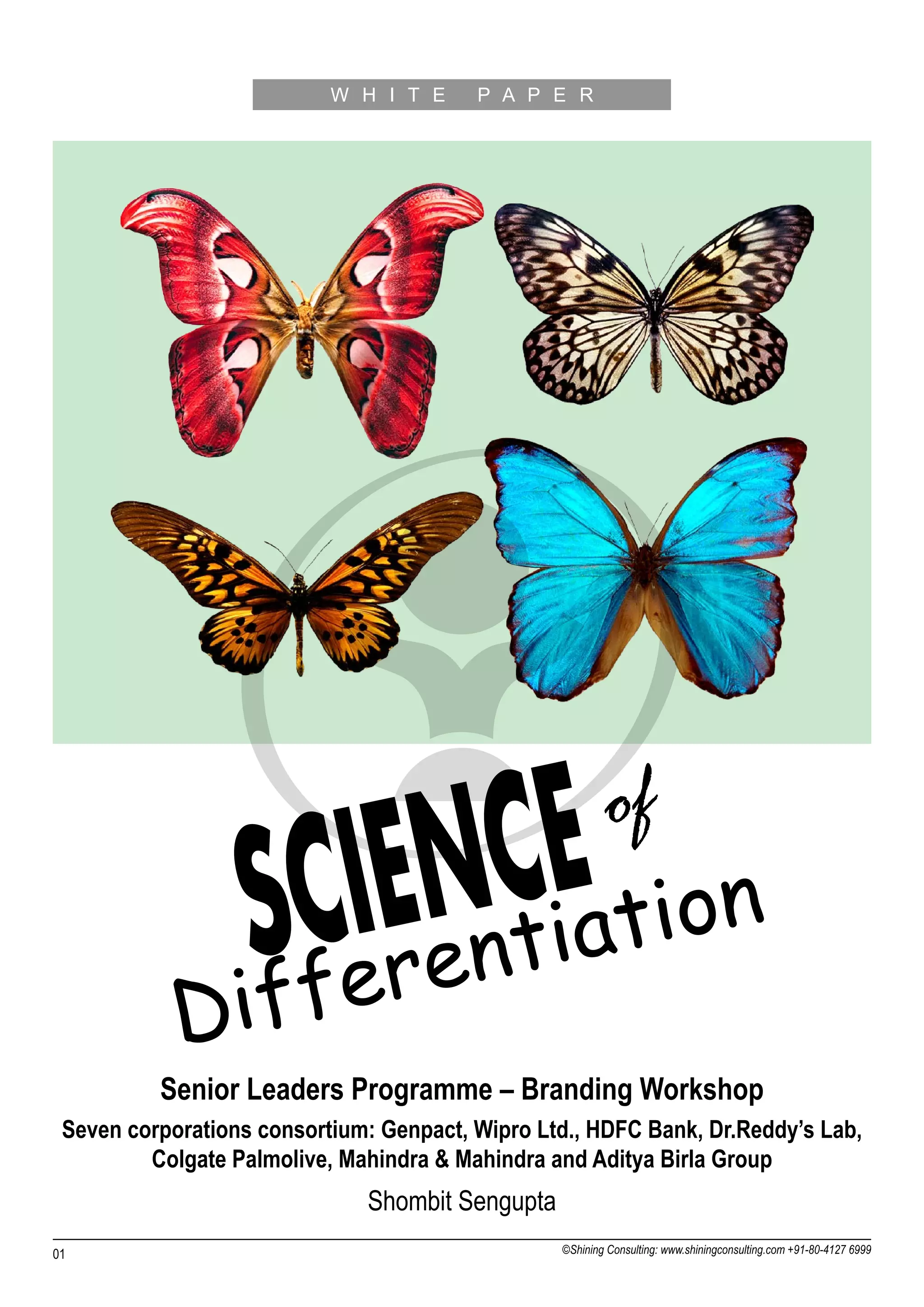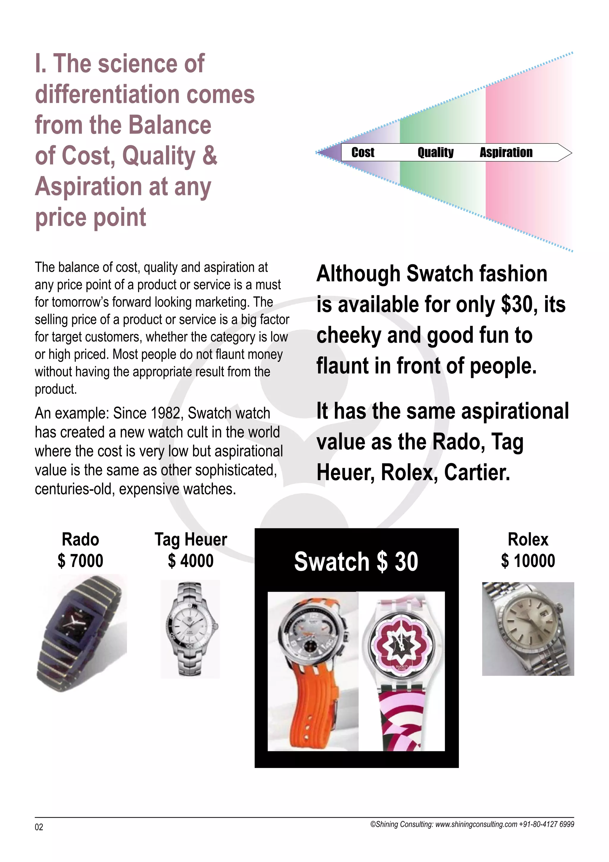 The white paper discusses the science of differentiation through balancing cost, quality, and aspiration. It provides examples of how brands like Swatch watches, McDonald's, and Benetton have found success in different markets by achieving this balance. The document also outlines how traditional products like Camembert cheese and cream cheese were transformed into branded products through differentiation. It profiles the Japanese company TOTO and how they elevated and branded toilet and bathroom products through innovative technology and a focus on quality.